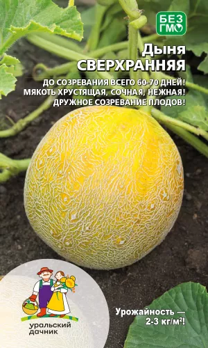 Ультраскороспелый сорт с изумительно вкусными плодами. От появления всходов до первого сбора урожая проходит 56-65 дней. Плоды яркие, нарядные, жёлтые с оранжевыми пятнами и полосками. Мякоть сочная, нежная, тающая во рту. Специалисты отмечают насыщенный вкус с приятным сладким послевкусием. Лучше всего дыни удаются на тёплых грядках и при умеренном поливе. Для сортов скороспелой группы они неплохо транспортируются. Хранятся, не теряя своих качеств, до 15-20 дней.