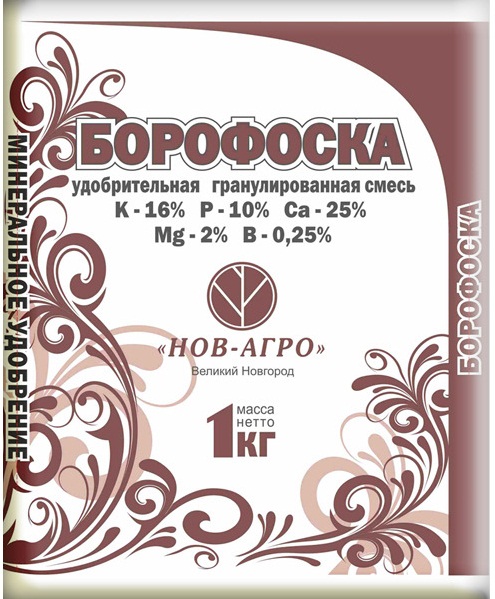 Борофоска - применяется на всех видах почв под все виды культур как высокоэффективное удобрение пролонгированного действия. В состав входят только активные природные макроэлементы, непосредственно участвующие в повышении плодородия почвы, улучшении качества урожая (устойчивости к вредителям и увеличения срока хранения).