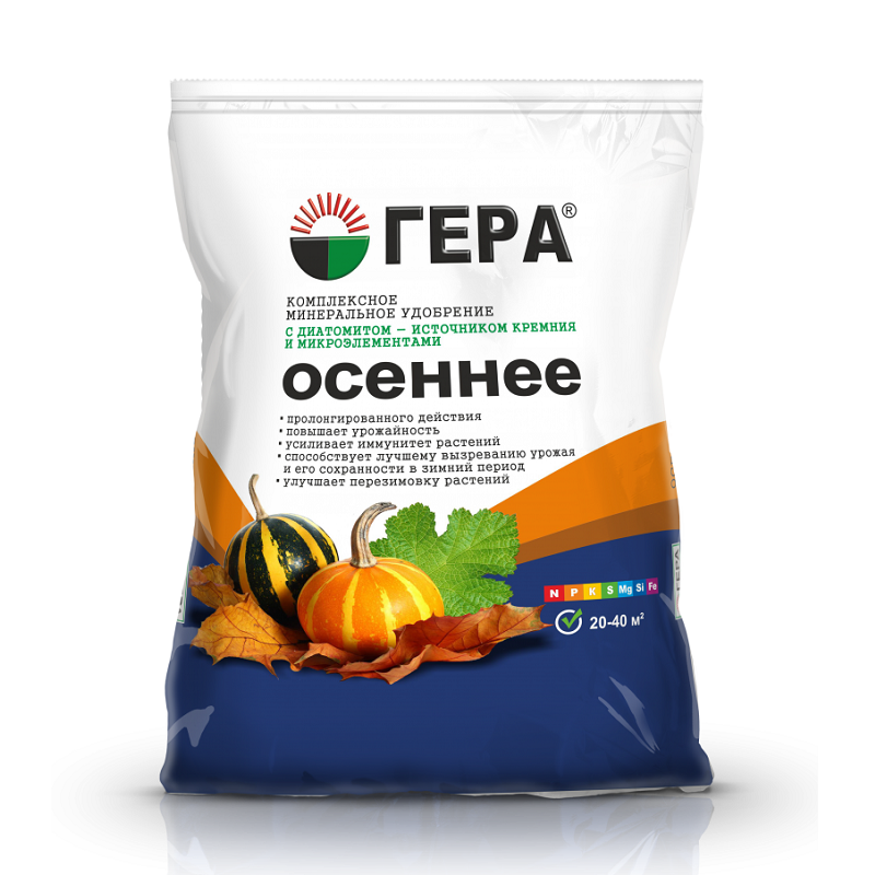 Агрохимикат «Гера Осеннее» – смешанное удобрение для основного внесения и подкормки в летне-осенний период плодово-ягодных и хвойных деревьев и кустарников, цветочно-декоративных культур, основного внесения под осеннюю перекопку и при осенней посадке земляничной рассады, плодово-ягодных и хвойных деревьев и кустарников, луковичных культур, а также удобрения и закладки газона осенью.